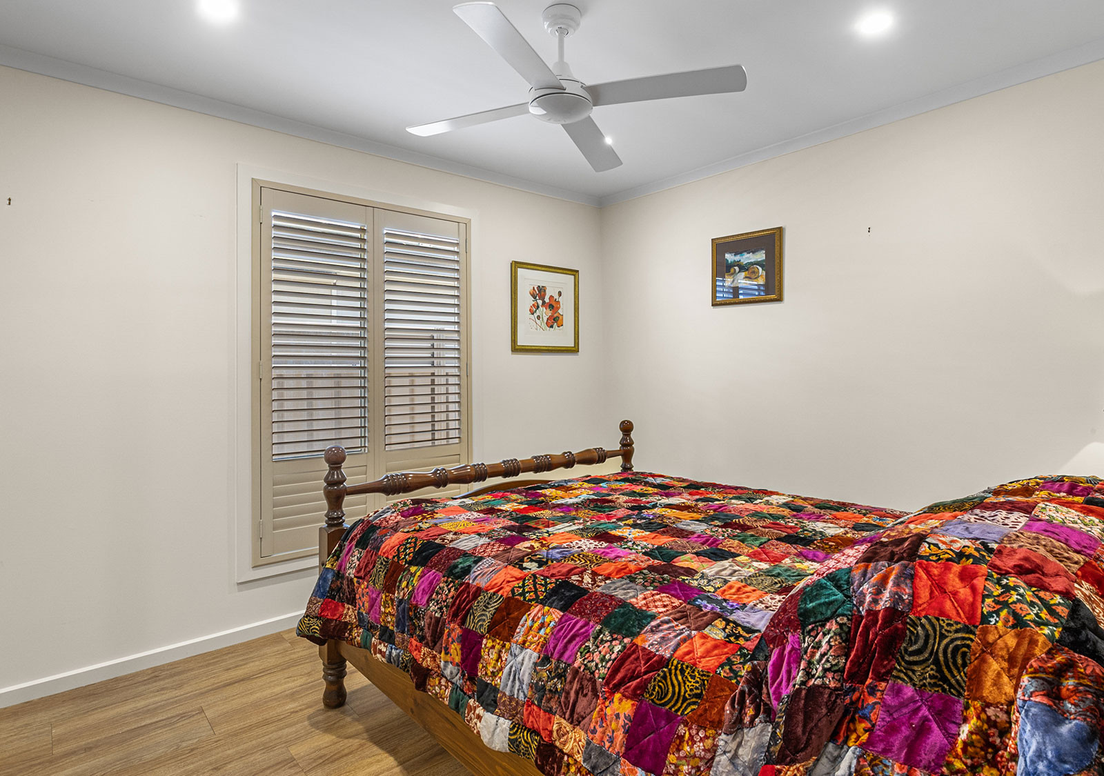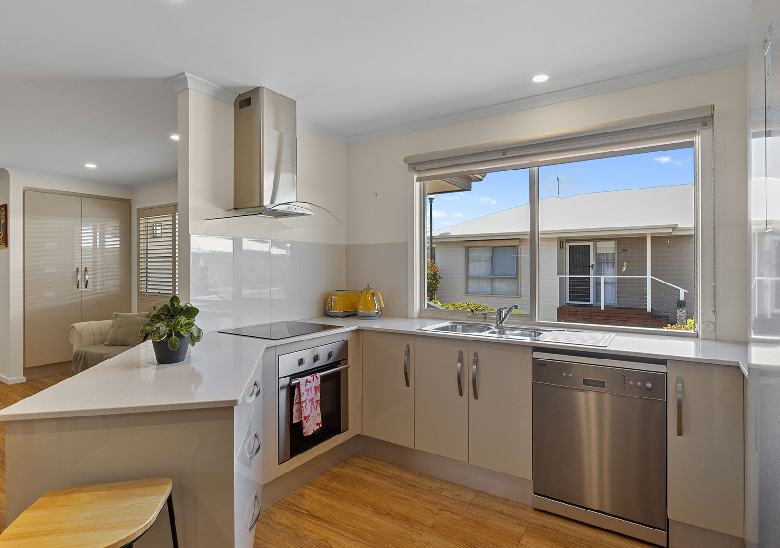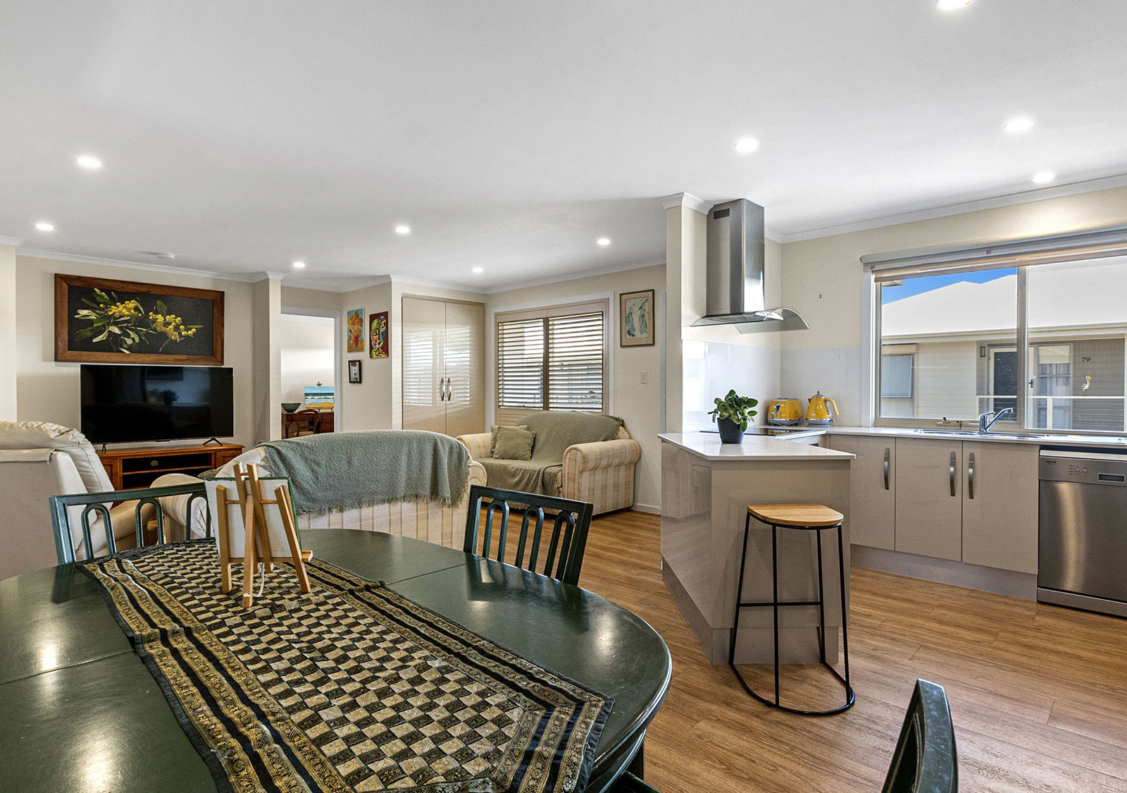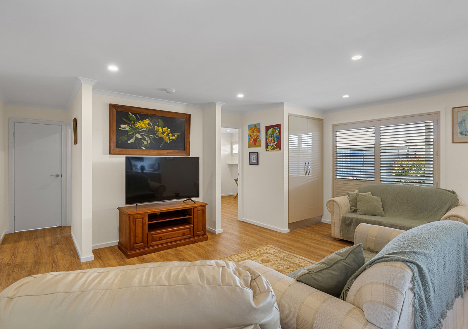 The outdoor area is designed for ease, with paved surrounds, outdoor blinds, and a good-sized shed for additional storage, ideal for those seeking a tidy, fuss-free lifestyle with minimal upkeep. Inside, the bathroom incorporates a cleverly positioned washing machine and large sink, enhancing everyday functionality.