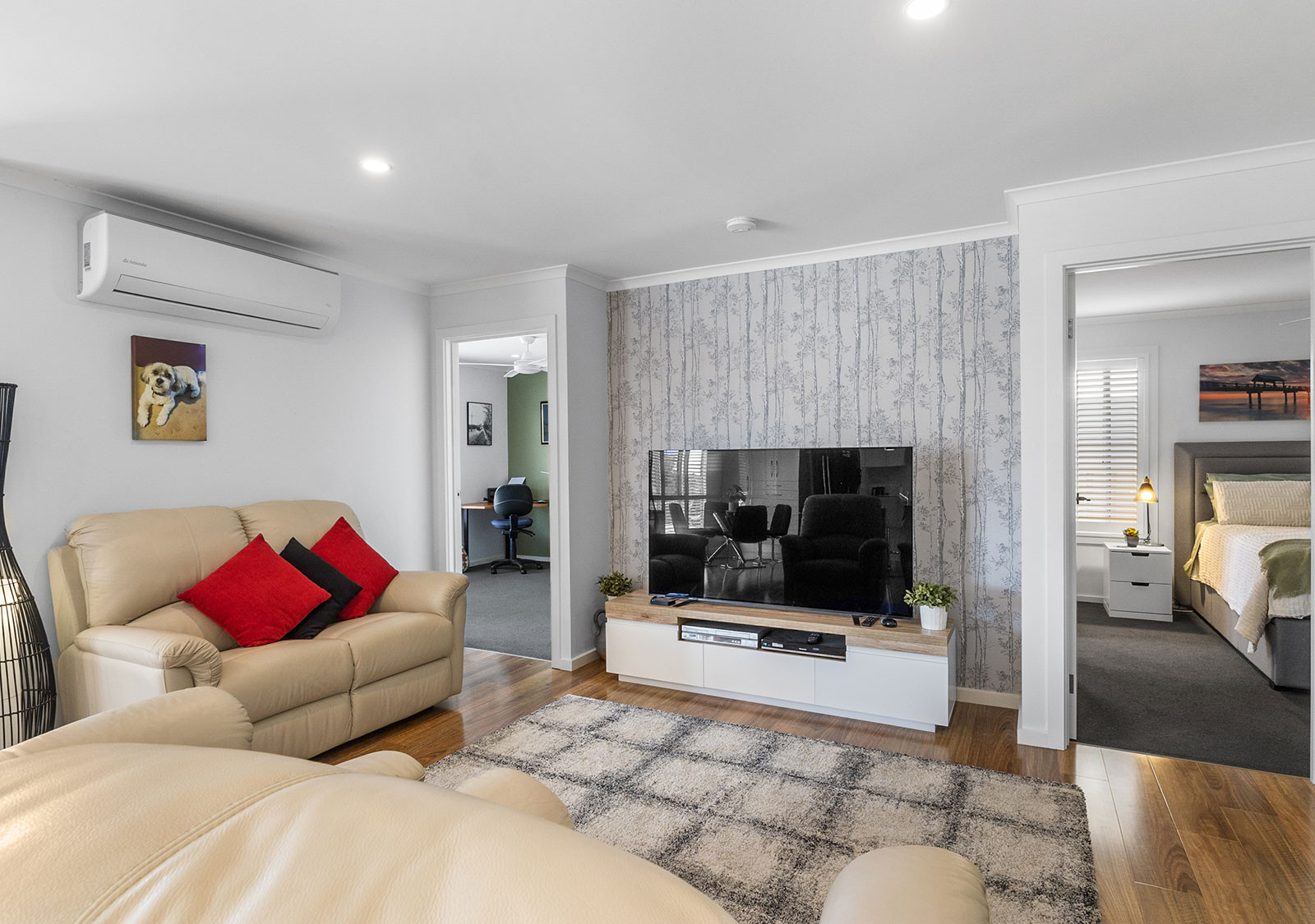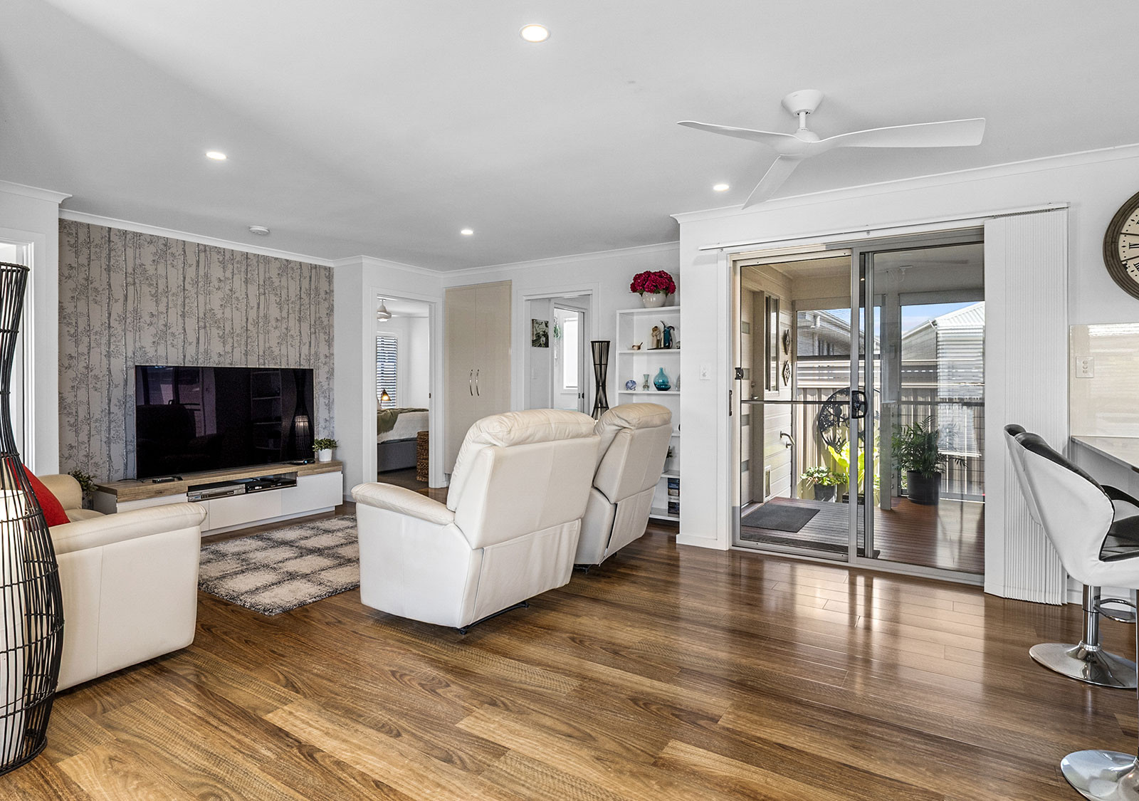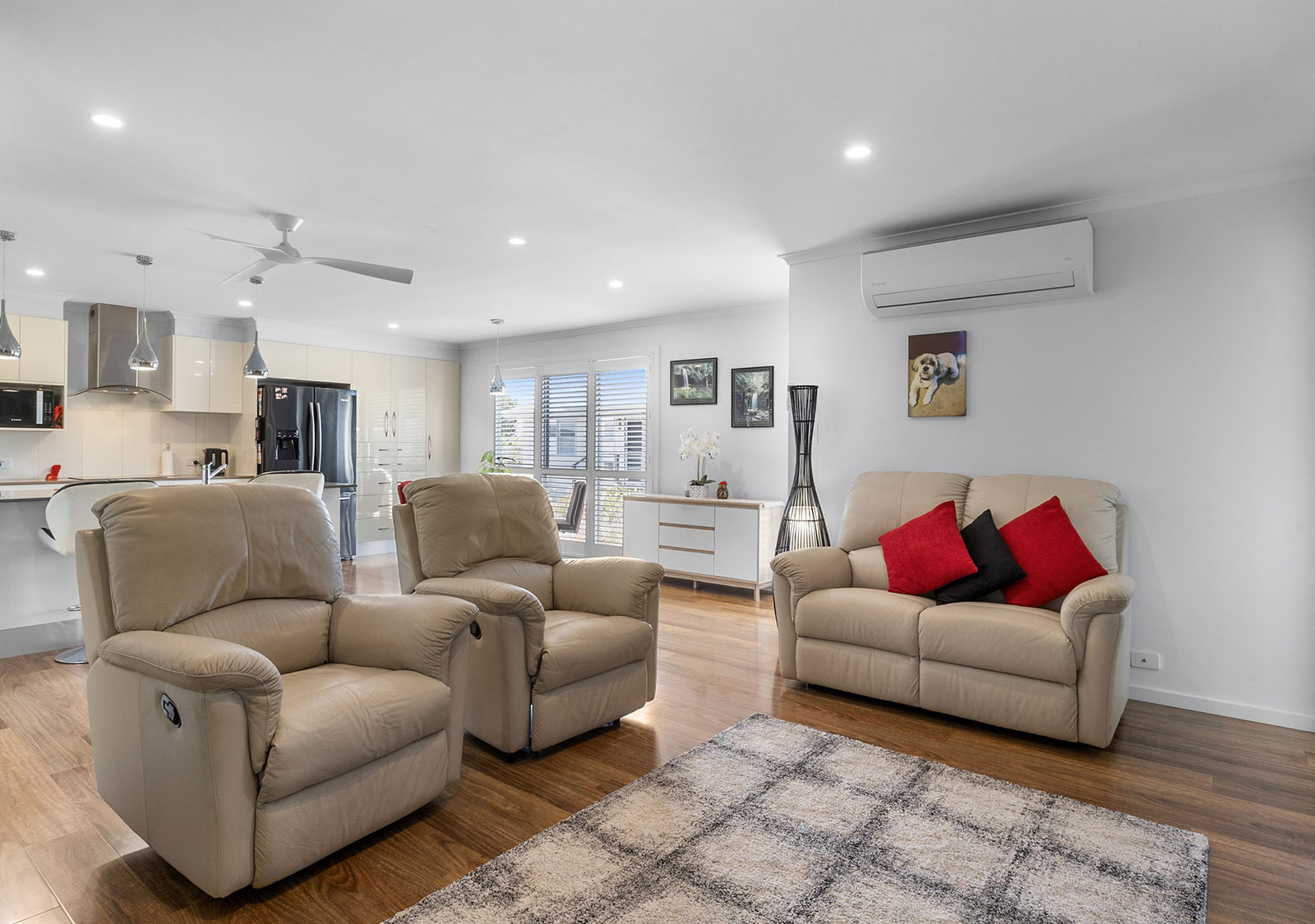 The modern electric kitchen is a standout, featuring extensive soft-close storage, multiple pantry cupboards, a waterfall stone island bench with pendant lighting, filtered tap water, dishwasher, full-size oven, and microwave provision. Lighting dimmers enhance the living zones, front bedroom, and rear deck, while whisper-quiet ceiling fans and split system air conditioning ensure year-round comfort.