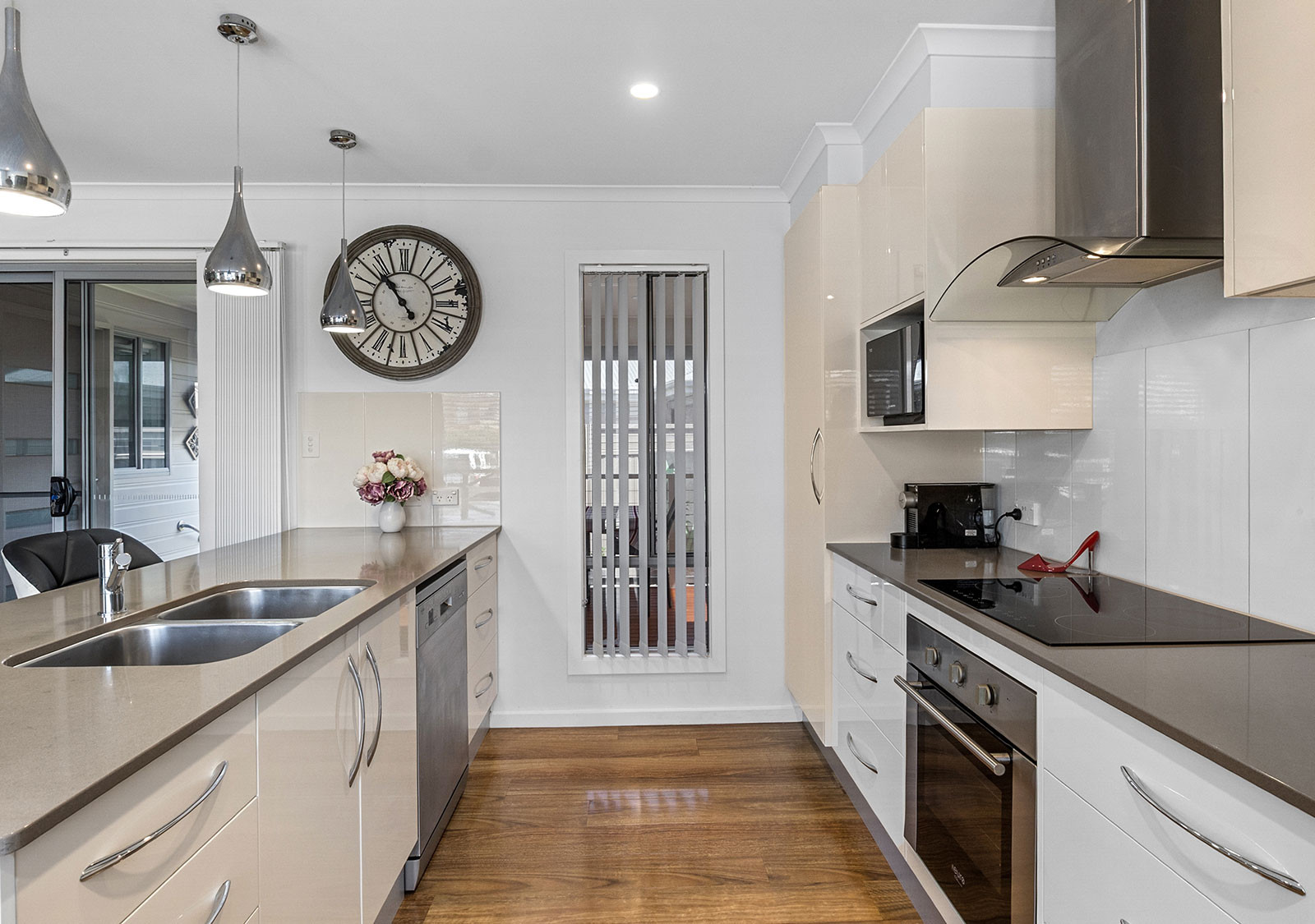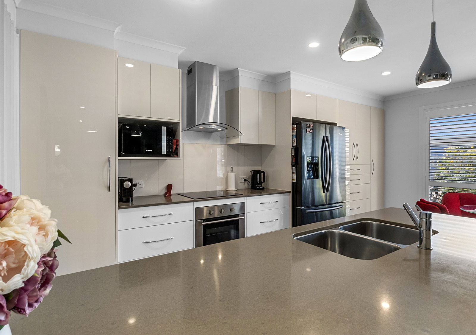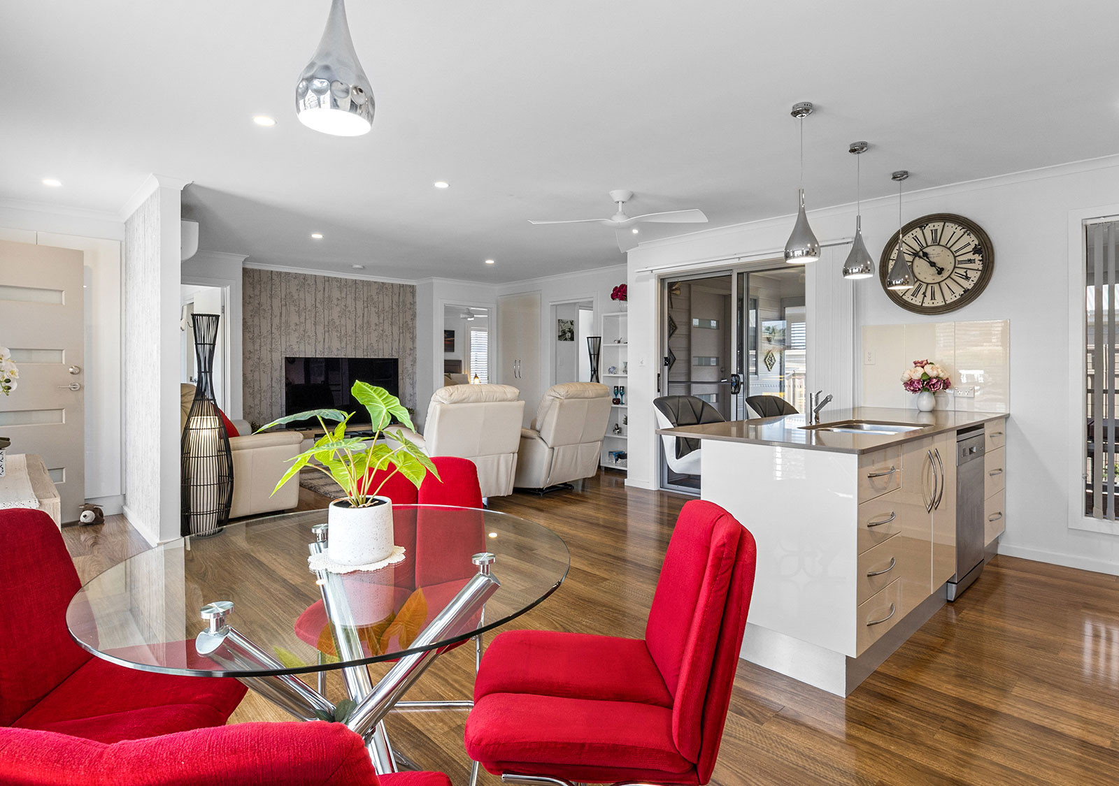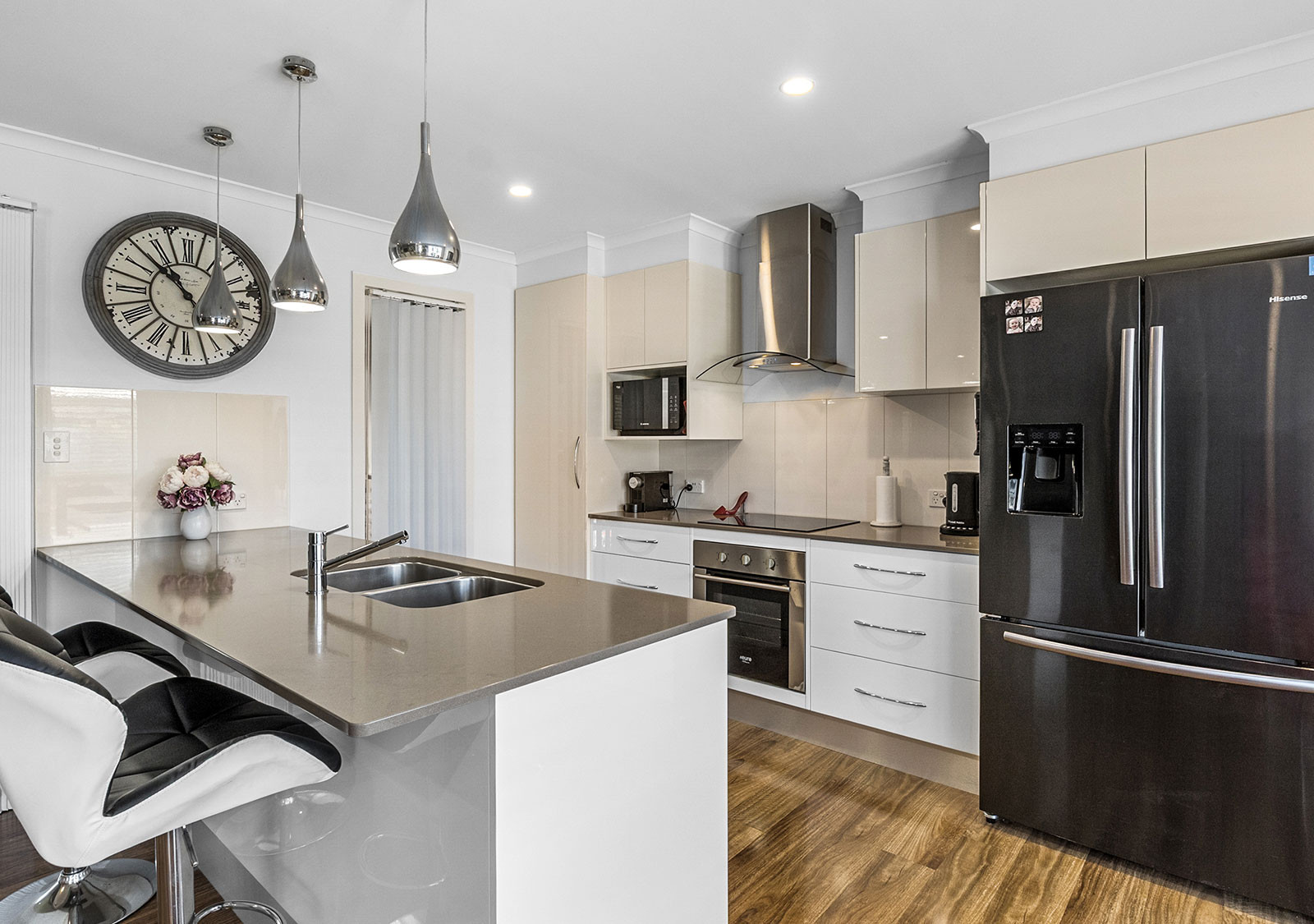 The modern electric kitchen is a standout, featuring extensive soft-close storage, multiple pantry cupboards, a waterfall stone island bench with pendant lighting, filtered tap water, dishwasher, full-size oven, and microwave provision. Lighting dimmers enhance the living zones, front bedroom, and rear deck, while whisper-quiet ceiling fans and split system air conditioning ensure year-round comfort.
