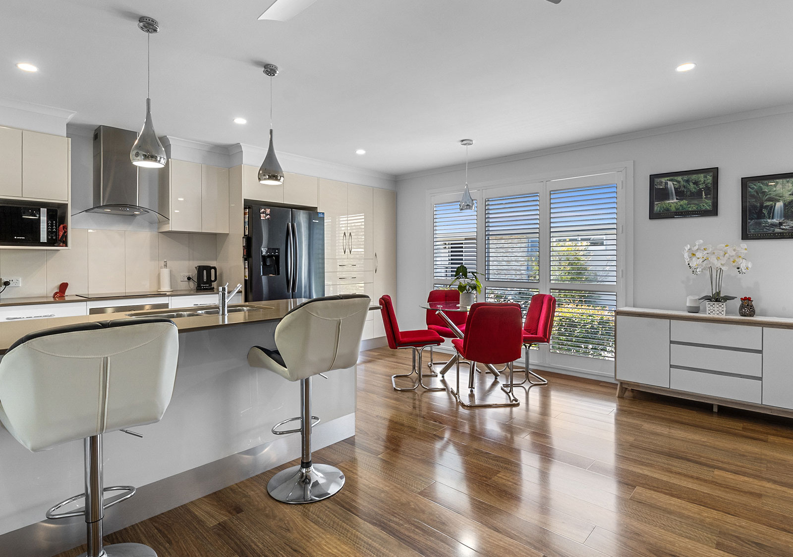 Designed for comfort and practicality, the home offers a spacious bathroom layout plus additional toilet and separate laundry. The extra-wide, double-length enclosed carport with automatic panel-lift door has storage shelving, and room for two garden sheds. Premium flooring flows through the living areas, complemented by quality carpets to the bedrooms and plantation shutters throughout.