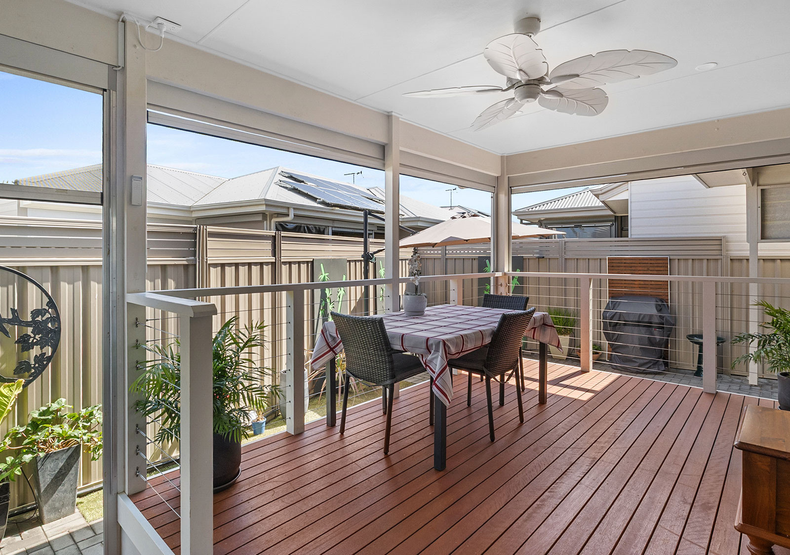Outdoor living is superb, with a rear entertaining deck fitted with zip-track blinds, ceiling fan, and wall heater, plus a separate cantilevered shaded area ideal for BBQs and relaxing with friends. Privacy is enhanced with slatted fence extensions to neighbouring boundaries.